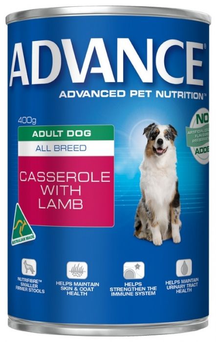 Advance Adult All Breed Casserole with Lamb Advance dog food formulas deliver optimal nutrition for Australian pets using scientific knowledge and over 45 years of manufacturing experience. This super premium, Australian made, canned dog food is complete and balanced to support the health and wellbeing of your adult dog. It is fortified with beneficial nutrients including antioxidants to help strengthen the immune system, zinc and linoleic acid for healthy skin and a shiny coat, as well as prebiotic fibres to promote healthy bacteria in the gut for better digestive health and smaller, firmer stools. Advance Adult All Breed Casserole with Lamb contains controlled levels of minerals and is highly digestible to help reduce the risk of lower urinary tract disease.