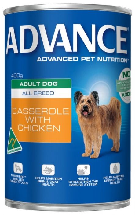 Advance Adult All Breed Casserole with Chicken Advance dog food formulas deliver optimal nutrition for Australian pets using scientific knowledge and over 45 years of manufacturing experience. This super premium, Australian made, canned dog food is complete and balanced to support the health and wellbeing of your adult dog. It is fortified with beneficial nutrients including antioxidants to help strengthen the immune system, zinc and linoleic acid for healthy skin and a shiny coat, as well as prebiotic fibres to promote healthy bacteria in the gut for better digestive health and smaller, firmer stools. Advance Adult All Breed Casserole with Chicken contains controlled levels of minerals and is highly digestible to help reduce the risk of lower urinary tract disease.