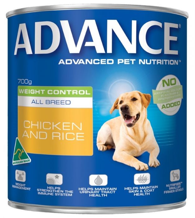 Advance Adult Weight Control All Breed Chicken & Rice Advance dog food formulas deliver optimal nutrition for Australian pets using scientific knowledge and over 45 years of manufacturing experience. This super premium, Australian made, canned dog food is complete and balanced to support the health and wellbeing of your less active or obesity prone adult dog. It contains fewer calories to aid weight management and is fortified with beneficial nutrients including antioxidants to help strengthen the immune system, zinc and linoleic acid to improve skin and coat condition, and prebiotic fibres to promote healthy bacteria in the gut for better digestive health and smaller, firmer stools. Advance Adult Weight Control All Breed Chicken & Rice contains controlled levels of minerals and is highly digestible to help reduce the risk of lower urinary tract disease.