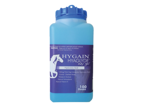 Introducing the Hygain Hyaglyde. This product contains Hyaluronic acid (HA) which plays a vital role in maintaining the health of connective tissue and optimizing normal joint function. The core ingredient, HA, is a naturally occurring substance found in various connective tissues in the horse's body. HA contributes significantly to maintenance of cartilage health and elasticity, joint fluid viscoelasticity, and lubrication of the entire joint mechanism. In addition, HA has anti-inflammatory properties, especially useful for high-motion joints such as those in equine limbs. The horse maintains considerable reservoirs of HA within its body, yet as horses mature and more athletic demands are placed on them inflammation leads to breakdown of HA in the joint fluid. The loss of HA leads to lower viscoelasticity in the joint fluid and further inflammation, which can damage cartilage and make the joint disease worse.