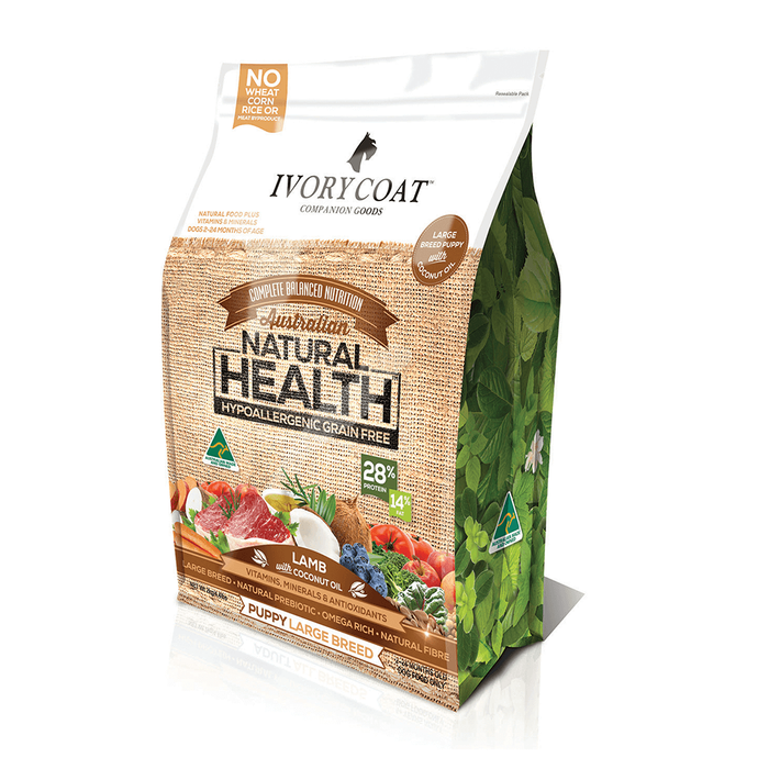 Ivory Coat Large Breed Puppy Food Ivory Coat Grain Free Large Breed Puppy Food is a high quality, natural diet developed specifically for growing puppies. This all-natural, grain free dry food is formulated using Australian lamb meal, peas and other wholesome vegetables to provide your growing large breed puppy with the highly digestible energy and protein they need. Ivory Coat recipes are made in Australia from high quality, Australian-sourced ingredients and are rich in antioxidants from super foods like kale and blueberries to support a healthy immune system. With the addition of flaxseeds and salmon oil they are rich in omega fatty acids for skin and coat health and also contain a natural pre-biotic and natural fibre to support healthy digestion.