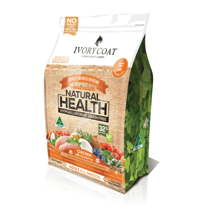 Ivory Coat Chicken & Coconut Oil Ivory Coat Chicken & Coconut Oil is packed full of wholesome, natural ingredients to support the long term health of your adult dog. This all-natural, grain free dry food is formulated using Australian chicken meal, vegetables and coconut oil making it an excellent source of highly digestible protein and energy. Ivory Coat recipes are made in Australia from high quality, Australian-sourced ingredients and are rich in antioxidants from super foods like kale and blueberries to support a healthy immune system. With the addition of flaxseeds and salmon oil they are rich in omega fatty acids for skin and coat health and also contain a natural pre-biotic and natural fibre to support healthy digestion.