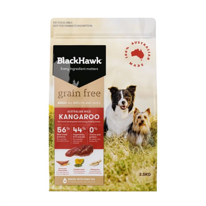 Black Hawk Grain Free - Australian Wild Kangaroo Black Hawk Grain Free Kangaroo is a high quality, Australian made, grain free diet for adult dogs. This high quality, grain free dry food contains functional ingredients from nature with known beneficial properties like blueberries, dandelion and rosemary. With added food grade emu oil, it is rich in omega fatty acids for healthy skin and a shiny, lustrous coat. This grain free, natural formula contains no wheat, corn, barley or rice and is free from artificial flavours, colours and preservatives.