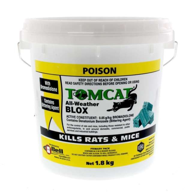 TOMCAT All-Weather BLOX is a single-feeding anticoagulant rodenticide containing the active ingredient, Bromadiolone. It is an excellent clean-out and maintenance bait to control mice and rats, including warfarin-resistant Norway rats. TOMCAT BLOX is specially formulated with an optimal blend of food-grade ingredients and a small amount of paraffin. The result is a highly palatable, yet weatherable, bait that works well in wet and dry conditions. Bait acceptance with TOMCAT is superior due to its highly palatable formulation. Plus, manufactured with Bell's extrusion process, TOMCAT BLOX has multiple edges that appeal to a rodent's desire to gnaw. Rodents can consume a lethal dose in just one feeding. Bait shyness is not a problem with TOMCAT because mortality occurs a few days after bait is consumed. TOMCAT is also less toxic to non-target animals, in both primary and secondary poisoning situations, than other single-feeding anticoagulants. The antidote, Vitamin K1, is readily available and there is a time factor for treatment. For ease of use, the pre-measured 28g BLOX has a hole in the center which lets technicians place it on bait securing rods in tamper-resistant bait stations. It can also be nailed or wired to rafters and ceilings or placed in tight locations.'