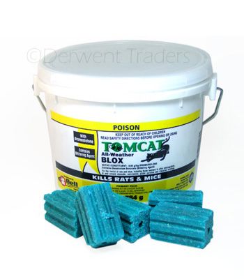 TOMCAT All-Weather BLOX is a single-feeding anticoagulant rodenticide containing the active ingredient, Bromadiolone. It is an excellent clean-out and maintenance bait to control mice and rats, including warfarin-resistant Norway rats. TOMCAT BLOX is specially formulated with an optimal blend of food-grade ingredients and a small amount of paraffin. The result is a highly palatable, yet weatherable, bait that works well in wet and dry conditions. Bait acceptance with TOMCAT is superior due to its highly palatable formulation. Plus, manufactured with Bell's extrusion process, TOMCAT BLOX has multiple edges that appeal to a rodent's desire to gnaw. Rodents can consume a lethal dose in just one feeding. Bait shyness is not a problem with TOMCAT because mortality occurs a few days after bait is consumed. TOMCAT is also less toxic to non-target animals, in both primary and secondary poisoning situations, than other single-feeding anticoagulants. The antidote, Vitamin K1, is readily available and there is a time factor for treatment. For ease of use, the pre-measured 28g BLOX has a hole in the center which lets technicians place it on bait securing rods in tamper-resistant bait stations. It can also be nailed or wired to rafters and ceilings or placed in tight locations.'