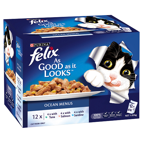 Felix Feline Ocean Menus Felix As Good As It Looks Ocean Menus are delicious meals precisely prepared with tender meaty and fishy pieces in a scrumptious jelly which look and smell enticing. Spoil your cat with this array of highly palatable flavours. This selection contains three different flavours: Tuna in jelly, Salmon in jelly, and Sardine in jelly.