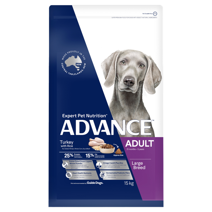 ADVANCE™ Adult Large+ Breed Dry Dog Food - Turkey 15kg is a super premium food for dogs with select natural ingredients. Supports dental health through mechanical abrasion to help reduce plaque and tartar accumulation. Formulated to support vascular health and cardiac function. Also contains nutrients to support immune health, joint health, digestive health and a healthy skin and shiny coat, ADVANCE is scientifically formulated to help improve dog health. TURKEY IS THE NUMBER #1 INGREDIENT Australian Made Super Premium Dog Food HEART HEALTH Formulated with a unique blend of nutrients including Taurine, Arginine and Vitamin E. These nutrients have been shown to support vascular health and cardiac function. JOINT HEALTH Contains stabilised Green-Lipped Mussel Powder (SGLMP), a natural cocktail of functional ingredients that has been clinically proven to help manage joint health in dogs. HEALTHY SKIN & SHINY COAT Contains enhanced levels of zinc and linoleic acid. These nutrients along with natural sources of omega 3 and omega 6 fatty acids have been shown to help improve skin & coat condition. IMMUNE HEALTH Contains scientifically proven levels of Vitamin E to help increase the level of antioxidants in your pet. Antioxidants help prevent cellular damage and provide a natural defence for your pet against Australia’s harsh climatic conditions. NUTRIFIBRE SMALLER FIRMER STOOLS Beet pulp and inulin act as natural prebiotics which promote healthy bacteria in the gut, resulting in smaller, firmer stools. DENTAL HEALTH Kibbles of certain size and shape help reduce plaque and tartar accumulation through mechanical abrasion to promote dental health.