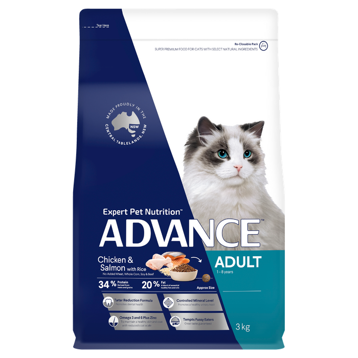 ADVANCEā„¢ Adult Cat Dry Cat Food - Chicken & Salmon 3kg is a super premium food for cats with select natural ingredients. Contains nutrients to support dental health, urinary tract health, immune health and a healthy skin and shiny coat, ADVANCE is scientifically formulated to help improve cat health. CHICKEN IS THE NUMBER #1 INGREDIENT Australian Made Super Premium Cat Food REDUCES HAIRBALLS Includes the natural active ingredient Beet Pulp. This fibre source has been shown to effectively reduce the frequency of hairballs. URINARY TRACT HEALTH High digestibility and controlled levels of minerals to promote optimal water turnover and a healthy urinary tract. HEALTHY SKIN & SHINY COAT Contains enhanced levels of zinc and linoleic acid. These nutrients along with natural sources of omega 3 and omega 6 fatty acids have been shown to help improve skin & coat condition. DENTAL HEALTH The inclusion of Sodium Tripolyphosphate (STPP) binds salivary calcium, helping prevent plaque calcification, to promote dental health. IMMUNE HEALTH Contains scientifically proven levels of Vitamin C and Vitamin E to help increase the level of antioxidants in your pet. REDUCES LITTER BOX ODOUR Natural Yucca Extract to help reduce litter box odours.