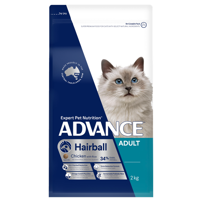 Advance Adult Cat Hairball - Chicken Advance cat food formulas deliver optimal nutrition for Australian pets using scientific knowledge and over 45 years of manufacturing experience. This super premium, Australian made, dry cat food is complete and balanced to support the nutritional requirements of your adult cat and is designed to help reduce hairballs with the addition of psyllium husk and slippery elm bark which assist ingested hair to move gently through the digestive tract. It contains beneficial nutrients including antioxidants to help strengthen the immune system, zinc and linoleic acid for healthy skin and a shiny coat as well as yucca extract to help minimise litter box odour. Advance Adult Cat Hairball is formulated with controlled mineral levels and high digestibility to help support urinary tract health and is designed to support good oral health and fresh breath.