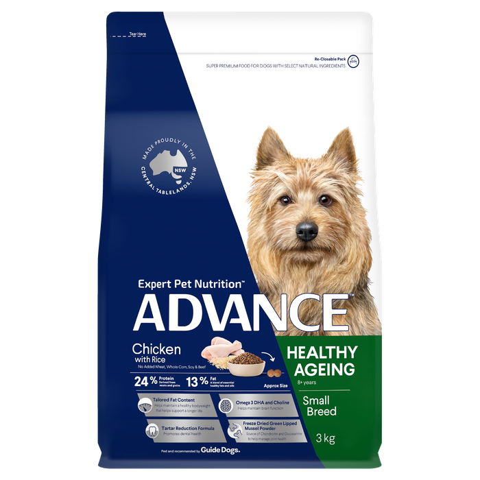 ADVANCE™ Mature Toy/Small Breed Dry Dog Food - Chicken 3kg is a super premium food for senior dogs with select natural ingredients. Contains nutrients to support dental health, immune health, cognitive care and a healthy skin and shiny coat, ADVANCE is scientifically formulated to help improve dog health. CHICKEN IS THE NUMBER #1 INGREDIENT Australian Made Super Premium Dog Food JOINT HEALTH Contains stabilised Green-Lipped Mussel Powder (SGLMP), a natural cocktail of functional ingredients that has been clinically proven to help manage joint health in dogs. COGNITIVE CARE As senior dogs age, they begin to experience memory loss and an altered temperament. This product contains a unique combination of antioxidants and enhanced levels of DHA. These nutrients have been shown to help maintain brain function. HEALTHY SKIN & SHINY COAT Contains enhanced levels of zinc and linoleic acid. These nutrients along with natural sources of omega 3 and omega 6 fatty acids have been shown to help improve skin & coat condition. IMMUNE HEALTH Contains scientifically proven levels of Vitamin E to help increase the level of antioxidants in your pet. Antioxidants help prevent cellular damage and provide a natural defence for your pet against Australia’s harsh climatic conditions. NUTRIFIBRE SMALLER FIRMER STOOLS Beet pulp and inulin act as natural prebiotics which promote healthy bacteria in the gut, resulting in smaller, firmer stools. DENTAL HEALTH The inclusion of Sodium Tripolyphosphate (STPP) binds salivary calcium, helping prevent plaque calcification, to promote dental health.