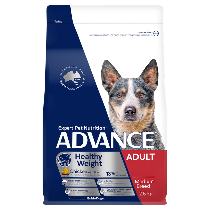 ADVANCE™ Weight Control All Breed Dry Dog Food - Chicken 2.5kg is an Australian made super premium food for dogs with select natural ingredients. Formulated so that your dog maintains a complete and balanced vitamin/mineral intake whilst consuming fewer calories. Supports dental health through mechanical abrasion to help reduce plaque and tartar accumulation. Also contains nutrients to support digestive health, immune health and a healthy skin and shiny coat, ADVANCE is scientifically formulated to help improve dog health. WEIGHT MANAGEMENT Formulated so that your dog maintains a complete and balanced vitamin/mineral intake whilst consuming fewer calories. To assist in weight loss, feed a combination of both wet and dry food to allow a larger meal to be fed, for the same number of calories. HEALTHY SKIN & SHINY COAT Contains enhanced levels of zinc and linoleic acid. These nutrients along with natural sources of omega 3 and omega 6 fatty acids have been shown to help improve skin & coat condition. IMMUNE HEALTH Contains scientifically proven levels of Vitamin E to help increase the level of antioxidants in your pet. Antioxidants help prevent cellular damage and provide a natural defence for your pet against Australia’s harsh climatic conditions. NUTRIFIBRE SMALLER FIRMER STOOLS Beet pulp and inulin act as natural prebiotics which promote healthy bacteria in the gut, resulting in smaller, firmer stools. DENTAL HEALTH Kibbles of certain size and shape help reduce plaque and tartar accumulation through mechanical abrasion to promote dental health. URINARY TRACT HEALTH High digestibility and controlled levels of minerals to promote increased water turnover and a healthy urinary tract. Australian pets need to rehydrate more regularly.