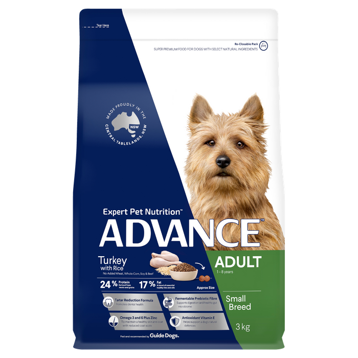 ADVANCE is scientifically formulated to help improve dog health. LONG COPY ADVANCE™ Adult Toy/Small Breed Dry Dog Food - Turkey 3kg is a super premium food for dogs with select natural ingredients. Contains nutrients to support dental health, digestive health, immune health and a healthy skin and shiny coat, ADVANCE is scientifically formulated to help improve dog health. TURKEY IS THE NUMBER #1 INGREDIENT Australian Made Super Premium Dog Food which contains high quality ingredients to tempt even the fussiest eater. HEALTHY SKIN & SHINY COAT Contains enhanced levels of zinc and linoleic acid. These nutrients along with natural sources of omega 3 and omega 6 fatty acids have been shown to help improve skin & coat condition. IMMUNE HEALTH Contains scientifically proven levels of Vitamin E to help increase the level of antioxidants in your pet. Antioxidants help prevent cellular damage and provide a natural defence for your pet against Australia’s harsh climatic conditions. NUTRIFIBRE SMALLER FIRMER STOOLS Beet pulp and inulin act as natural prebiotics which promote healthy bacteria in the gut, resulting in smaller, firmer stools. DENTAL HEALTH The inclusion of Sodium Tripolyphosphate (STPP) binds salivary calcium, helping prevent plaque calcification, to promote dental health.