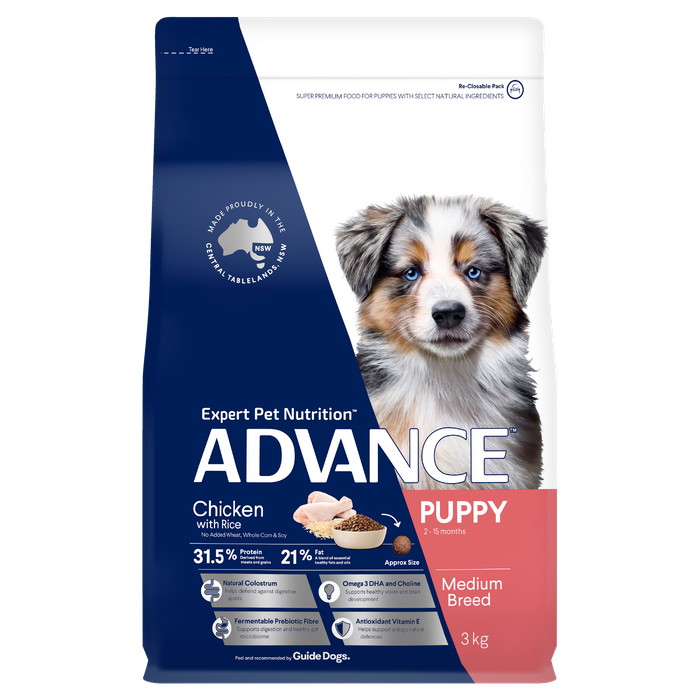 ADVANCE⢠Puppy Growth All Breed Dry Dog Food - Chicken 3kg is a super premium food for puppies with select natural ingredients. Contains nutrients to support brain development, digestive health, immune health and a healthy skin and shiny coat, ADVANCE is scientifically formulated to help improve dog health. CHICKEN IS THE NUMBER #1 INGREDIENT Australian Made Super Premium Dog Food SMART START Contains omega fish oil (natural source of DHA) and enhanced levels of nutrients that have been shown to help support brain development. HEALTHY SKIN & SHINY COAT Contains enhanced levels of zinc and linoleic acid. These nutrients along with natural sources of omega 3 and omega 6 fatty acids have been shown to help improve skin & coat condition. IMMUNE HEALTH Contains scientifically proven levels of Vitamin E to help increase the level of antioxidants in your pet. NUTRIFIBRE FOR DIGESTIVE HEALTH Beet pulp and inulin act as natural prebiotics which promote healthy bacteria in the gut, resulting in smaller, firmer stools.