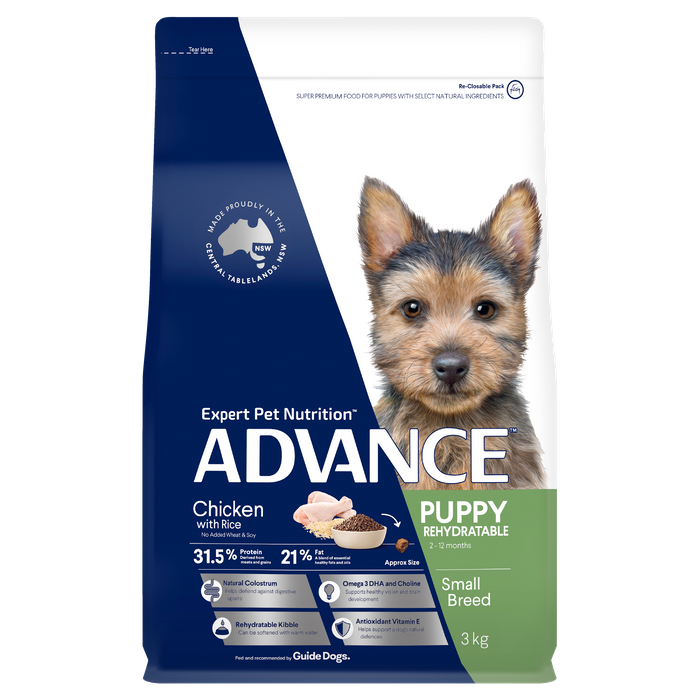 This super premium, Australian made, dry puppy food is complete and balanced to support the healthy development of your growing small or toy breed puppy. It is fortified with increased levels of DHA and choline to promote healthy brain development, as well as colostrum to help minimise the risk of digestive upsets. It also contains antioxidants to help strengthen the immune system, zinc and linoleic acid for healthy skin and a shiny coat, and prebiotic fibres to promote healthy bacteria in the gut for better digestive health and smaller, firmer stools. Advance Puppy Plus Rehydratable Toy & Small Breed has a smaller kibble size to suit little mouths, and is also able to be rehydrated with warm water to make it easier for very young puppies to eat.