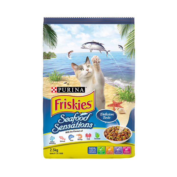 Friskies Dry Cat Food Adult Seafood Sensations Friskies, by Purina, formulate a selection of complete and balanced dry and wet food for your feline friend. Is your kitty a seafood lover? Look no further than Friskies Seafood Sensations! This dry cat food combines a delicious blend of salmon, tuna, shrimp, crab and seaweed, to deliver your cat a meal full of seafood yumminess!