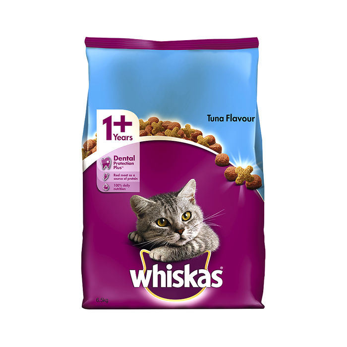 Whiskas Adult 1+ Years with Tuna Flavour Whiskas make delicious, 100% complete and balanced recipes for cats at all stages of life. This complete and balanced dry food contains all the protein, vitamins, minerals and energy that your adult cat needs. With delicious crunchy tuna flavoured biscuits, this formula also includes specially designed Dental Protection Plus pieces that act to scrub teeth clean with every chew to help reduce plaque and tartar buildup.