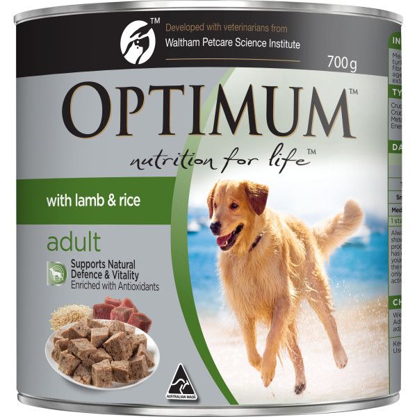Optimum Adult with Lamb and Rice Cans Optimum pet food is made in Australia and contains no artificial colours or flavours. Optimum Adult with Lamb and Rice wet food is a complete balanced and nutritionally complete diet for adult dogs of all breeds aged 1 year and over. Optimum adult wet can varieties are suitable for small, medium and large breeds and are best served in conjunction with Optimum dry food.
