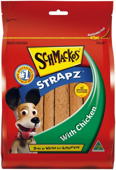 Schmackos Strapz with Chicken Schmackos treats are so delicious your dog will do anything to get one! These tasty dog treats are made in Australia from real meat, baked then air dried for a delicious snack with no added artificial flavours. Schmackos Strapz with Chicken are rich in quality lean meat making them high in protein and low in fat.