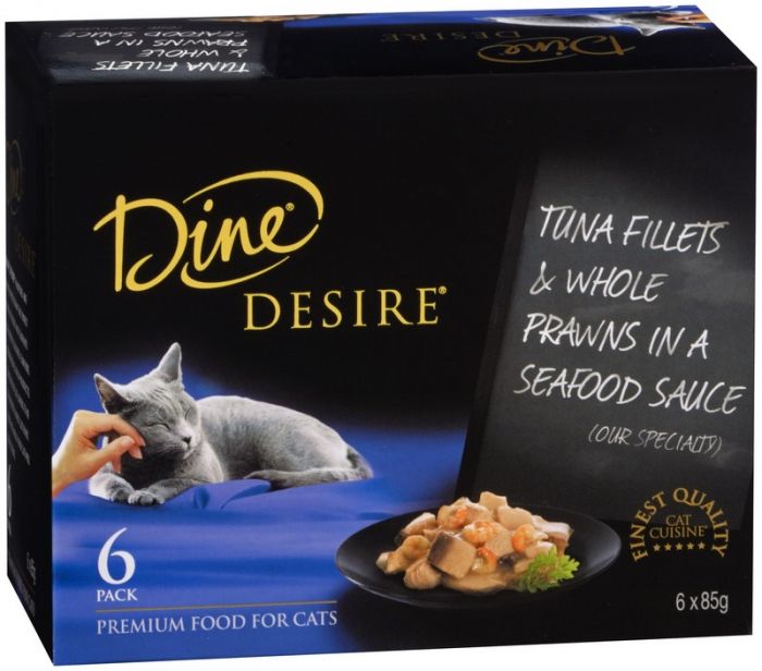 Dine Desire with Tuna Fillets and Prawns in a Seafood Sauce Dine cat food varieties are designed to appeal to even the most discerning feline connoisseurs. This delicious recipe contains finely filleted tuna and real prawn meat in a tasty seafood sauce for a tempting flavour and texture combination that is sure to please even the fussiest of felines.