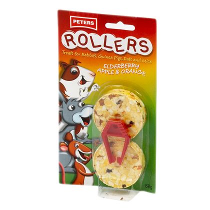 Peters Rollers Peters Rollers are great tasting treats for rabbits, guinea pigs, mice and rats. Made from a blend of cereal and dried elderberry, orange and apple pieces, each disc will provide hours of nibbling pleasure for your pet. Hang a Roller on the side of the hutch to entice your pet to reach up and nibble it. Helps to keep your pet active and stimulated when confined to the enclosure. Suitable for all breeds of adult mice, rats, rabbits and guinea pigs. Feed Peters Rollers as a supplement to your pet’s main diet. INGREDIENTS INCLUDE: Flaked maize, Dried apple, Elderberry and Orange pieces.