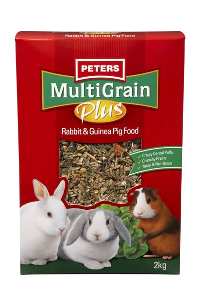 Peters MultiGrain Plus Peters MultiGrain Plus is a blend of crunchy grains, crispy cereal puffs and chewy carob tossed with sweet smelling oaten and lucerne chaff. Your pet will love the enticing flavours, textures and aromas to be found in MultiGrain Plus; each ingredient is specially selected to encourage the natural foraging behaviour of rabbits and guinea pigs. Mealtimes are sure to be interesting and fun as your pet searches out tasty morsels to nibble. And while your pet is nibbling and gnawing contentedly, the chewing action helps to keep teeth trim. Suitable for all breeds of adult rabbits and guinea pigs. INGREDIENTS INCLUDE: Pellets (containing Wheaten bran and pollard, Lupins, Barley, Lucerne, Clover, Lignin, Canola, Triticale, Lentils, Oats, Peas, Beans, Soya, Sunflower, Grape and products derived from those ingredients, Bentonite, Limestone, Dicalcium phosphate, Salt, Vitamins and Minerals), Wheat, Oats, Crushed maize, Black sunflower seed, Extruded cereal pieces, Oaten chaff, Lucerne chaff, Carob, Vegetable oil and Colours. Nutritional Analysis: Min Crude Protein 13.0% Min Crude Fibre 8.0% Min Crude Fat 4.0% Max Crude Salt (NaCl) 0.5% Max Calcium 0.5% Min Phosphorus 0.4% Rabbits and guinea pigs need high levels of fibre in their diets for healthy digestion and to keep teeth trim. As hay is an ideal source of fibre, we recommend feeding MultiGrain Plus with Peters Pasture Hay or Timothy Hay (keep a constant supply in your pet’s enclosure for grazing) and fresh fruit and vegetables each day.