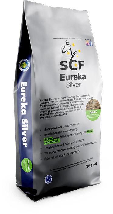 Eureka Silver is a “Oat Free” full feed specifically designed for the equine athlete. Eureka Silver is ideal for horses undertaking intense training such as racing, harness and higher level equestrian activities such as showjumping, eventing, camp drafting etc. Eureka Silver is also formulated to assist horses whom do not tolerate oats in their diet. • Steamed & flaked grains for energy. • Ideal for horses of many disciplines, up to intense training. • BioPAK protected live yeast, containing both Pre & Probiotics. • For a healthier gut & better grain utilisation. • Will improve microflora, reducing lactic acid in the caecum. • Better detoxification & use of proteins.