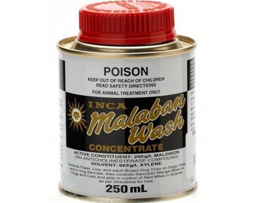 Malaban Wash Flea, Lice and Tick Treatment, 250ml Recommended for: Dogs, cats and directly on kennels Malaban Wash is a treatment that helps to control fleas, ticks and lice on dogs, cats and in kennel areas. It can also be used to control sarcoptic mange mites on dogs/cats and red mites in aviaries. It must not be used on puppies or kittens (under 3 months) and does not control paralysis ticks. For use on dogs for fleas - Mix 15ml of Malaban wash with 1L of water and use this solution to swab the animal. Repeat after 7-10 days if needed. You can also use this mixture to saturate the kennel area including cracks and crevices. For use on dogs for sarcoptic mange and ticks - Mix 30ml of Malaban wash with 1L of water and use this solution to swab the animal. Repeat after 7-10 days if needed. For use on cats for fleas - Mix 15ml of Malaban wash with 1L of water and use this solution to swab the animal. Repeat after 7-10 days if needed. Aviaries for red mites and lice - Mix 15ml of Malaban wash with 1L of water. Take birds out and then spray the area. Return the birds when the area is dry.