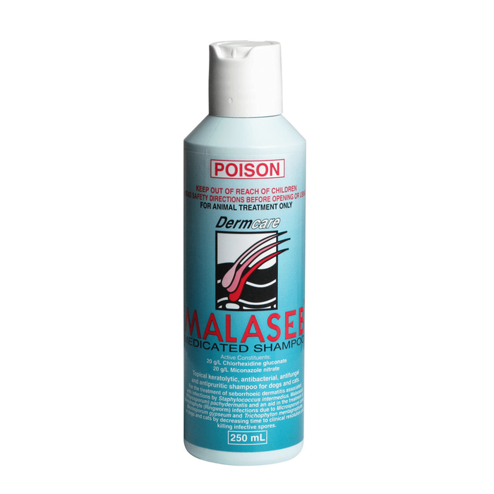 Dermcare Malaseb Shampoo Medicated, 250ml Bacterial skin infections in dogs need treatment and Malaseb shampoo is specifically formulated to help treat Sebborrhoeic Dermatitis (bacterial skin infection) and Dermatophytosis (ringworm). Chlorohexidine Gluconate works as the active constituent. It helps to remove dirt, scaly skin and grease whilst killing cutaneous micro-organisms that often cause dermatitis. This shampoo can also be used on cats.