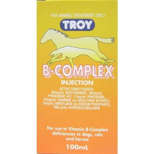 Composition: Nicotinamide 60mg/mL Pyridoxine HCl 20mg/mL Panthenol 17mg/mL Thiamine (as Disulphide Nitrate) 15mg/mL Riboflavin Sodium Phosphate 5mg/mL Hydroxocobalamin 200µg/mL. Indications: For use in Vitamin B-Complex deficiencies in dogs, cats and horses.