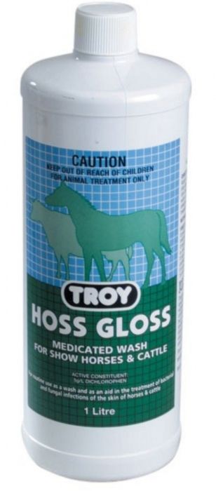 Medicated Shampoo Actions Dichlorophen has an antimicrobial effect and sodium lauryl ether sulphate promotes lathering. Indications For routine use as a shampoo and as an aid in the treatment of bacterial and fungal infections of the skin in dogs, horses and cattle. Directions for use Wet coat. Apply a small quantity of HOSS GLOSS medicated shampoo and massage into coat. Rinse. Reapply and massage into coat for 10 - 15 minutes. Rinse, removing excess with a scraper. Dry and groom. For bacterial or fungal infections wash the affected areas once daily until the treated area has healed. Withholding period Meat – Nil, Milk – Nil