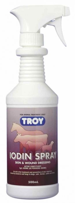 Actions Wounds, cuts, abrasions, ringworm, skin disinfection before surgery or injections, disinfection of the naval, castration and docking wounds, skin infections due to bacteria & fungi, cut teats and other wounds. Indications Skin and wound dressing. An aid in the treatment and prevention of skin infections caused by bacteria & fungi. Directions for use Shake well before use. Do not apply to eyes or mucous membranes. Hold pack approximately 10cm from the skin and spray the affected area. Precautions Government regulations limit iodine residues in milk. Thoroughly wash residues of TROY IODIN SPRAY from the teats and udder of cows prior to milking.