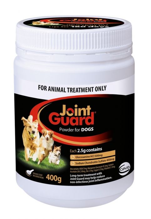 Joint Guard Dogs Joint Guard is a supplement powder for dogs prone to osteoarthritis and associated joint problems. Joint Guard contains Glucosamine hydrochloride, Chondroitin sulfate, Manganese and Methyl Sulfonyl Methane (MSM). This unique and clinically proven combination keeps joints as healthy and functional as possible. Joint Guard has been shown to have joint protective properties and anti-inflammatory benefits when regularly administered which ensures your dog is more comfortable and improves their mobility.
