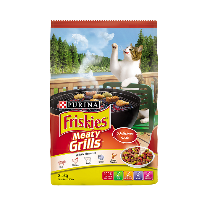 Friskies Dry Cat Food Adult Meaty Grills Friskies, by Purina, formulate a selection of complete and balanced dry and wet food for your feline friend. Does your kitty love variety? Look no further than Friskies Meaty Grills, with grillicious morsels of flavour including beef, chicken, lamb and turkey. Fortified with omega 3 & 6 fatty acids, vitamins, minerals and antioxidants, this dry food will satisfy your cats meaty cravings!