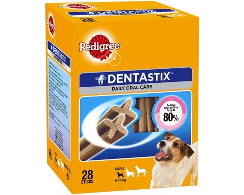 Dog dental chews are a useful way to help keep your dog's teeth clean. Pedigree dentastix feature a unique X-shape that encourages your dog to chew. The combination of the shape along with the texture, helps to scrape away plaque. According to Pedigree, 4 out of 5 dogs over the age of 3 have gum disease. When fed daily, Pedigree Dentastix has been scientifically shown to reduce tartar build-up by 80%. Helps to clean the teeth in hard to reach places including along the gum line. Tasty treat that your dog will enjoy. No added artificial colours and flavours.