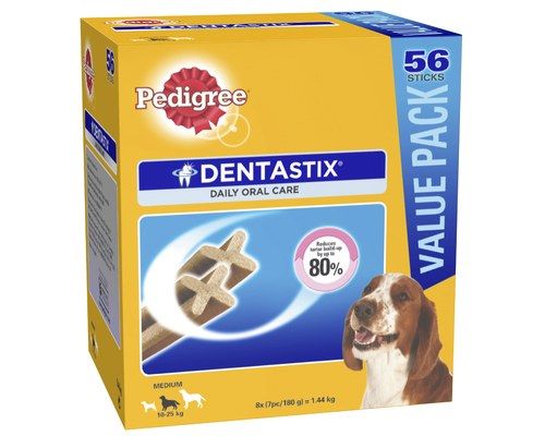 Dog dental chews are a useful way to help keep your dog's teeth clean. Pedigree dentastix feature a unique X-shape that encourages your dog to chew. The combination of the shape along with the texture, helps to scrape away plaque. According to Pedigree, 4 out of 5 dogs over the age of 3 have gum disease. When fed daily, Pedigree Dentastix has been scientifically shown to reduce tartar build-up by 80%. Helps to clean the teeth in hard to reach places including along the gum line. Tasty treat that your dog will enjoy. No added artificial colours and flavours.