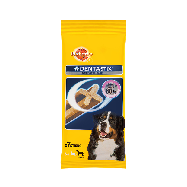 Dog dental chews are a useful way to help keep your dog's teeth clean. Pedigree dentastix feature a unique X-shape that encourages your dog to chew. The combination of the shape along with the texture, helps to scrape away plaque. According to Pedigree, 4 out of 5 dogs over the age of 3 have gum disease. When fed daily, Pedigree Dentastix has been scientifically shown to reduce tartar build-up by 80%. Helps to clean the teeth in hard to reach places including along the gum line. Tasty treat that your dog will enjoy. No added artificial colours and flavours.
