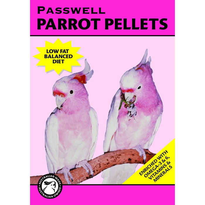 Passwell Parrot Pellets are the perfect food for large parrots and cockatoos including ring necks, conures, rosellas, galahs and sulphur-crests. They contain all essential nutrients in a balanced low fat formula designed to reduce obesity associated with sunflower seed diets. They are guaranteed to improve the health of your pet through elevated levels of essential amino acids, omega 3&6, vitamins and minerals. They are completely edible, made to reduce waste as well as mess.
