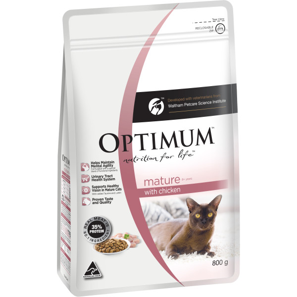 Optimum Mature Cat with Chicken Optimum pet food is made in Australia and contains no artificial colours or flavours. Optimum Mature Cat with Chicken is a dry food formulated for cats over 8 years of age. Mature cats require less calories than younger growing cats, and have a greater requirement for macronutrients that support joint care, mental agility, vision, and heart health. Optimum Mature Cat with Chicken diet contains a complete balanced mix of macronutrients, plus lutein for mental agility and vision, inulin for healthy digestion, and arginine and taurine for optimal heart health.