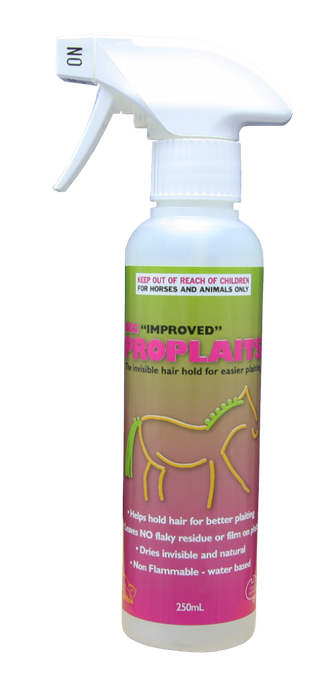 Your key to plaiting success with a new and improved formula for perfect hold and minimal fluff. Proplaits keeps the hair manageable while plaiting and has a gentle yet firm adhesive quality that holds the hair in place without being tacky. And because its water based, Proplaits simply washes off in water without any sticky residue. Proplaits also saves you time. With the use of a neck rug or hood, plaits can be completed with Proplaits the night before leaving the hair tight and firm overnight and allowing you more time during your competition morning. Unlike other plaiting products, Proplaits leaves no white flakes or marks, has no harmful drying agents and, once dry, has a healthy shine to enhance the natural appearance of your perfect plaits. The NRG Team has also improved the spray nozzle making applications a breeze.