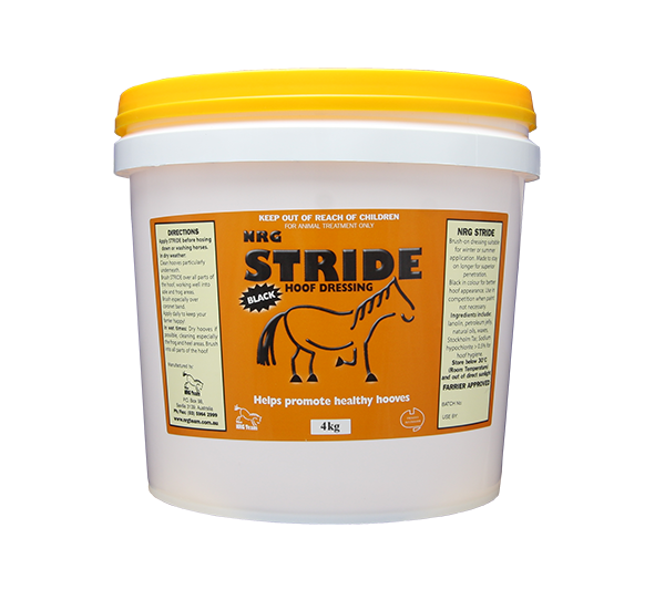 Dress and nourish your horses’ hooves at the same time with Stride Hoof Dressing from The NRG Team. Stride is one of Australia’s favourite natural black dressing alternatives for keeping horses hooves looking good and performing soundly. This clever mix of quality ingredients including Lanolin, Pine Tar, Selected Waxes, Natural Oils, and Petroleum Jelly will nourish the hooves, keep them looking good in the ring, performing soundly between shoeing, and crack-free during long spells in the paddock.