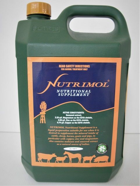 Nutrimol® is a liquid mineral supplement which contains seaweed extract, copper, zinc and magnesium chelates. Nutrimol® contains over 60 essential trace elements, minerals and amino acids, with molasses added to increase palatability. It is a nutritional package ideal for all animals including horses, sheep, beef, dairy, alpacas, lamas, pigs, ostriches, deer and poultry. alleviating sub clinical vitamin and mineral deficiencies, especially magnesium, iodine, selenium, copper and zinc Increasing resistance to certain diseases, promoting better utilisation of feed Reducing the incidence of scouring and birthing abnormalities Improving coat quality and overall appearance Assisting recovery from stress Preparation for conception, pregnancy, birth, shows and sale