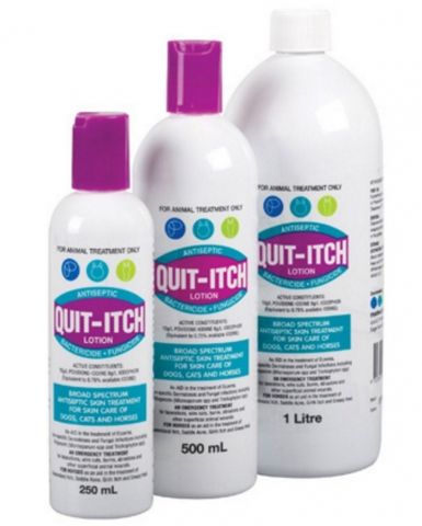 Quit Itch Lotion 1lt. A broad spectrum antiseptic skin treatment for dogs, cats and horses. For the treatment of: Eczema, Dermatoses, Fungal Infections including Ringworms, lacerations, wire cuts, burns, abrasions and other superficail wounds. For horses also helps treat QUEENSLAND ITCH, Saddle Acne Girth Itch and Greasy Heal.