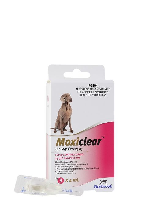 MOXICLEAR Dog >25kg 3pk Pink Moxiclear is a broad spectrum spot-on designed for the treatment and prevention of fleas, biting lice, the prevention of heartworm, and the treatment and control of intestinal worms ( roundworm, hookworm, whipworm) ear mites and mange mites in Dogs >25kg. Developed as an easy to use spot-on, Imidacloprid acts topically to kill fleas within an hour, whilst the Moxidectin acts systemically to treat intestinal worms, lungworm, ear mites and to prevent heartworm. Moxiclear is a broad spectrum spot-on designed for the treatment and prevention of fleas, biting lice, the prevention of heartworm, and the treatment and control of intestinal worms ( roundworm, hookworm, whipworm) ear mites and mange mites in Dogs > 25kg. Developed as an easy to use spot-on, Imidacloprid acts topically to kill fleas within an hour, whilst the Moxidectin acts systemically to treat intestinal worms (roundworm, hookworm, whipworm), ear mites, mange mites and to prevent heartworm.