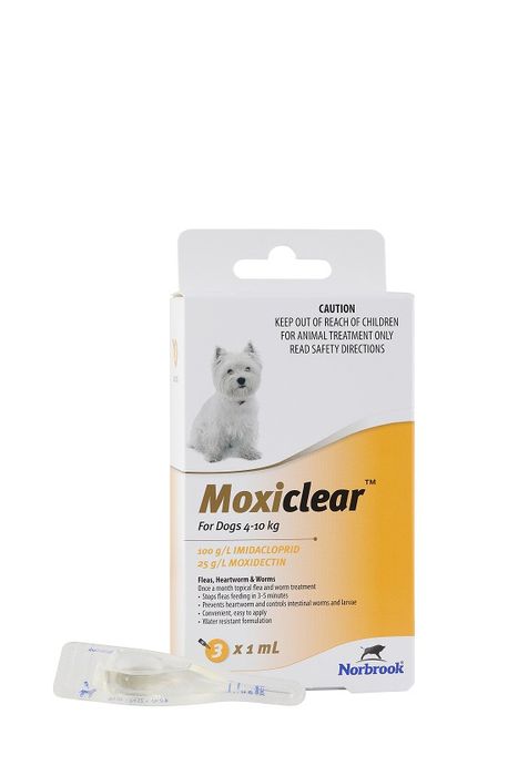 MOXICLEAR Dog 4-10kg 3pk Moxiclear is a broad spectrum spot-on designed for the treatment and prevention of fleas, biting lice, the prevention of heartworm, and the treatment and control of intestinal worms ( roundworm, hookworm, whipworm) ear mites and mange mites in Dogs 4-10kg . Developed as an easy to use spot-on, Imidacloprid acts topically to kill fleas within an hour, whilst the Moxidectin acts systemically to treat intestinal worms, lungworm, ear mites and to prevent heartworm. Moxiclear is a broad spectrum spot-on designed for the treatment and prevention of fleas, biting lice, the prevention of heartworm, and the treatment and control of intestinal worms ( roundworm, hookworm, whipworm) ear mites and mange mites in Dogs 4-10kg. Developed as an easy to use spot-on, Imidacloprid acts topically to kill fleas within an hour, whilst the Moxidectin acts systemically to treat intestinal worms (roundworm, hookworm, whipworm), ear mites, mange mites and to prevent heartworm.