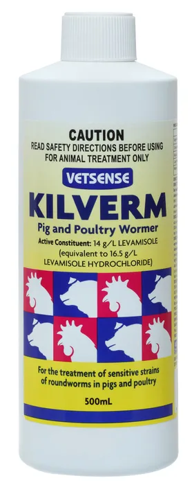 Kilverm is effective against sensitive strains of the following parasites; Pigs – Large Round worms (Ascaris suum) – Mature/Immature Stomach Worms – Stomach Worm (Hyostrongylus rubidus) – Nodule Worm (Oesophagostomum dentatum) – Lung Worm (Metastrongylus spp.) – Mature Kidney Worm (Stephanurus dentatus) NSW and QLD Only Poultry – Large Roundworms (Ascaridia galli) – Caucal Worm (Heterakis gallinae) – Hairworm (Capillaria spp.) The above are the most important intestinal worms in fowls, turkey and other birds.