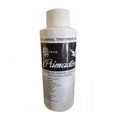 Inca Primactor which is a vitamin and mineral supplement for racing pigeons. Size: 1lt Directions: Shake bottle for use. Dosage rate: add 4ml to each litre of drinking water, daily. Mix well. Individual dosage: when bird is being prepared for a special event, or recuperating after severe stress, individual dosing is recommended at the rate of 3 drops of Primactor (0.15ml) twice daily, direct to beak. When to use: Experience has shown that the best results are achieved when Primactor is administered throughout the racing season commencing 4 weeks prior to first race.