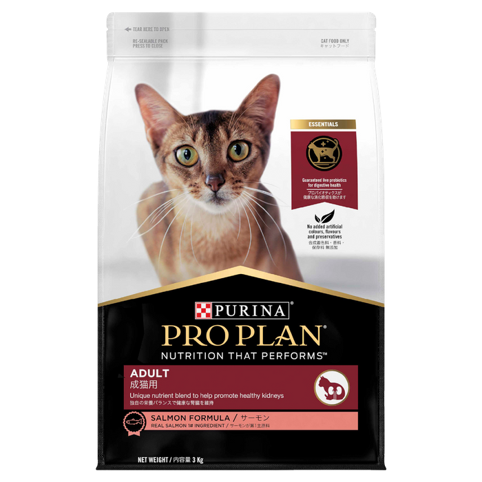 Salmon (dehydrated salmon, salmon); brewers rice; dehydrated chicken-natural glucosamine source; whole grain wheat; oats; corn protein; tuna (dehydrated tuna, tuna) poultry oil; minerals, vitamins, amino acids, organic acids and flavours (including calcium, phosphorus, sodium, chloride, potassium, magnesium, manganese, copper, zinc, iron, iodine, selenium, vitamin A, vitamin B1, vitamin B2, vitamin B3, folic acid, vitamin B5, vitamin B6, vitamin B12, vitamin C, vitamin D, vitamin E, choline, arginine, taurine, pyrophosphates, beta-carotene, liver flavour); fish oil; dried Bacillus coagulans fermentation product and natural antioxidants.