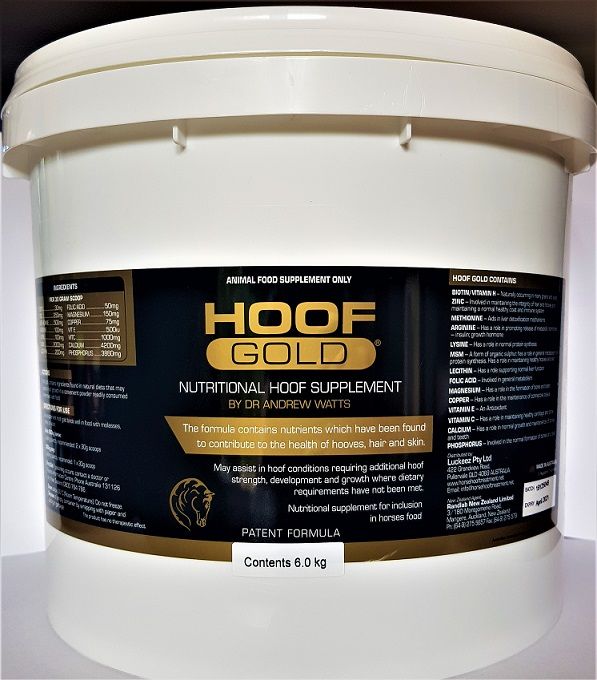 HOOF GOLD has been formulated after 27 years of field experience with debilitated horses feet, working with farriers and clients to produce the highest quality supplement at the best value on the market. HOOF GOLD has been specifically designed and made in Australia for our diverse and harsh conditions in all Equine disciplines. Despite the multitude of hoof formulations available on the global market, as an experienced Equine Clinician I always found myself recommending several supplements to be given simultaneously to ensure the patient received all the nutrients required for repair of often critical hoof injuries. HOOF GOLD ingredient composition is the result of exposure to thousands of clinical cases where effective stimulation of strong healthy hoof wall growth was vital. Our final product is 100% produced in Australia at a fully Certified Australian Veterinary Pesticides and Veterinary Medicine (APVMA) Approved Laboratory. All the staff involved in the production of HOOF GOLD are dedicated to the production of the highest quality product with the highest quality ingredients.
