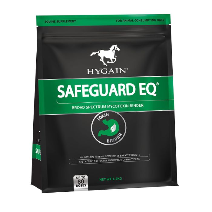 The same trusted and proven formula of our toxin binder for horses but in a great new look! HYGAIN® SAFEGUARD EQ® is a pelleted broad-spectrum mycotoxin binder formulated for all equines, which may assist in the quick and effective absorption of mycotoxins, minimizing associated negative health and performance problems. Due to the difficulty to predict the occurrence of mycotoxins in your horse’s diet, it is advised to add a broad-spectrum mycotoxin binder to your horse’s diet, which simply binds the mycotoxins and passes them through the digestive tract, exiting with the manure.