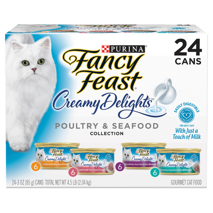 Make every day delicious with FANCY FEAST Classic recipes. An extensive array of delicious, mouth-watering flavours and tantalising textures your cat will love. FANCY FEAST Classic Creamy Delights is a highly palatable, gourmet wet cat food made for adult cats. This collection pack features slow-cooked cuts in a creamy sauce as well as fine paté with a touch of real milk. A glorious feast for your cat! Available in a convenient 24 pack, consisting of 6 x chicken and 6 x tuna varieties, as well as 6 x chicken and 6 x salmon paté varieties. All FANCY FEAST Classic recipes are 100% complete and balanced, with the goodness of high protein and the essential vitamins and minerals your cat needs, making mealtime delicious and nutritious.